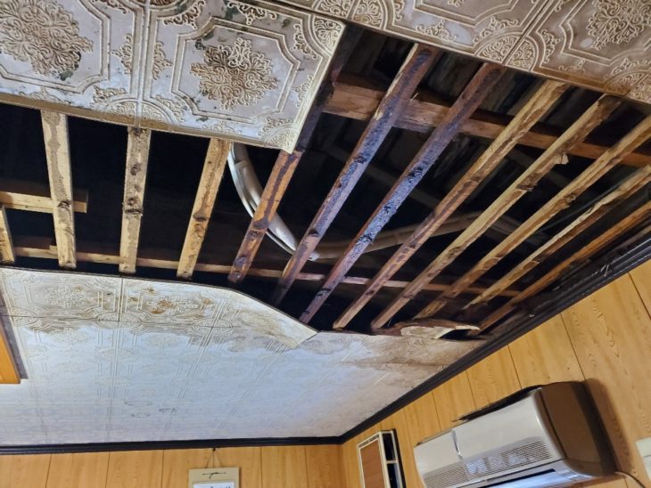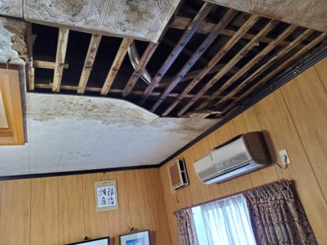 | お客様のご要望 | 屋根から水漏れがしていて、突然天井が落ちてしまいました。 助けて下さい。 雨が降るのが怖いです。 雨漏りを直してください。 予算はかけたくないです。 |