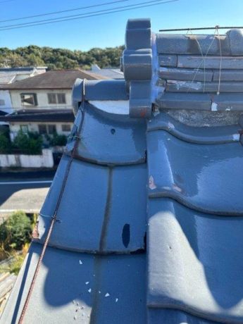 棟 銅線締め直し工事 鬼巻きシ-リング工事 軒袖銅線穴シーリング 東側巴瓦 北面面戸漆喰塗り替え工事 |
