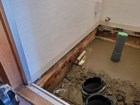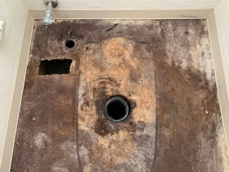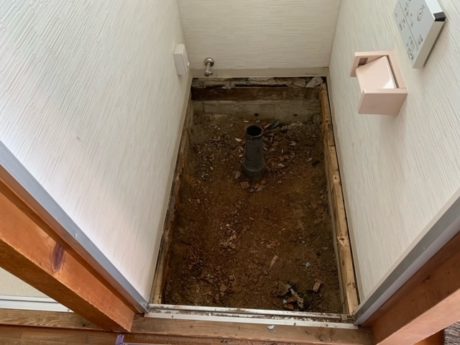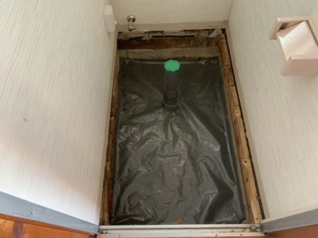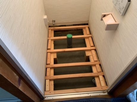 | お客様のご要望 | 数年前にリフォ-ムをしたトイレの床がだんだんと傾いてきて、便器が外れそうになってきました。 床下がどうなっているのか不安です。 一度床を壊して床下の状態を見て下さい。 |