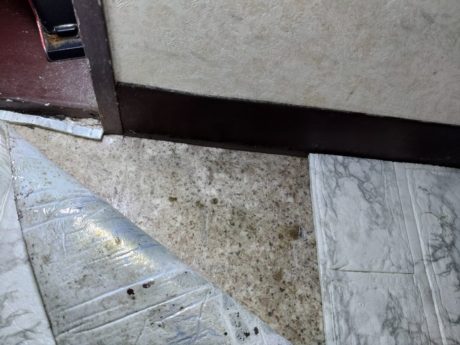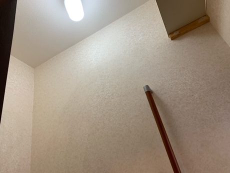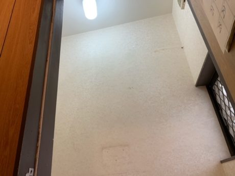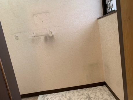床のクッションフロア-が嫌で、 ホームセンタ-で買ってきて床材を、奥様が上に置いていらっしゃいました。 床のクッションフロア-と壁天井のクロスと床材と壁材の間のソフト巾木 内装をすべて、やり直すので奥様のお好きなキラキラでリフォームです。 まだまだ使える付属品の棚付き紙巻き器や棚などは、一度取り外してから再用します。 |