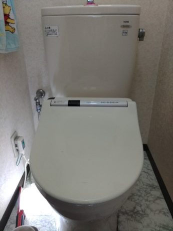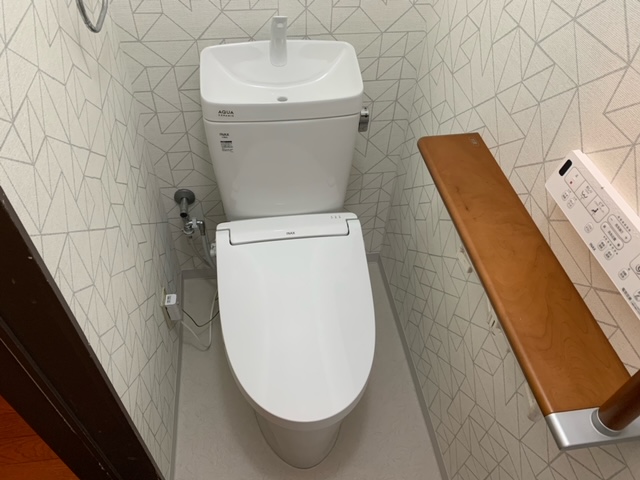 | お客様のご要望 | 20年前の東海豪雨の時、冠水してしまいリフォームしたトイレは、 不満だらけでした。 ウォシュレット漏水をきっかけに、トイレ全体をきらきらのレストル-ムに取替です。 |