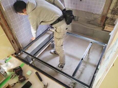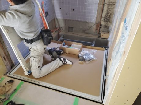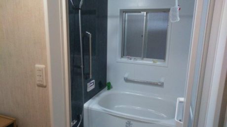 | お客様のご要望 | 従来のタイルの浴槽は、真四角で小さくて深いポリ浴槽。 身体の大きな息子さんは、体を丸めて入るのが嫌で、シャワーだけで済ましていました。 手足をのびのびと伸ばして入りたい |